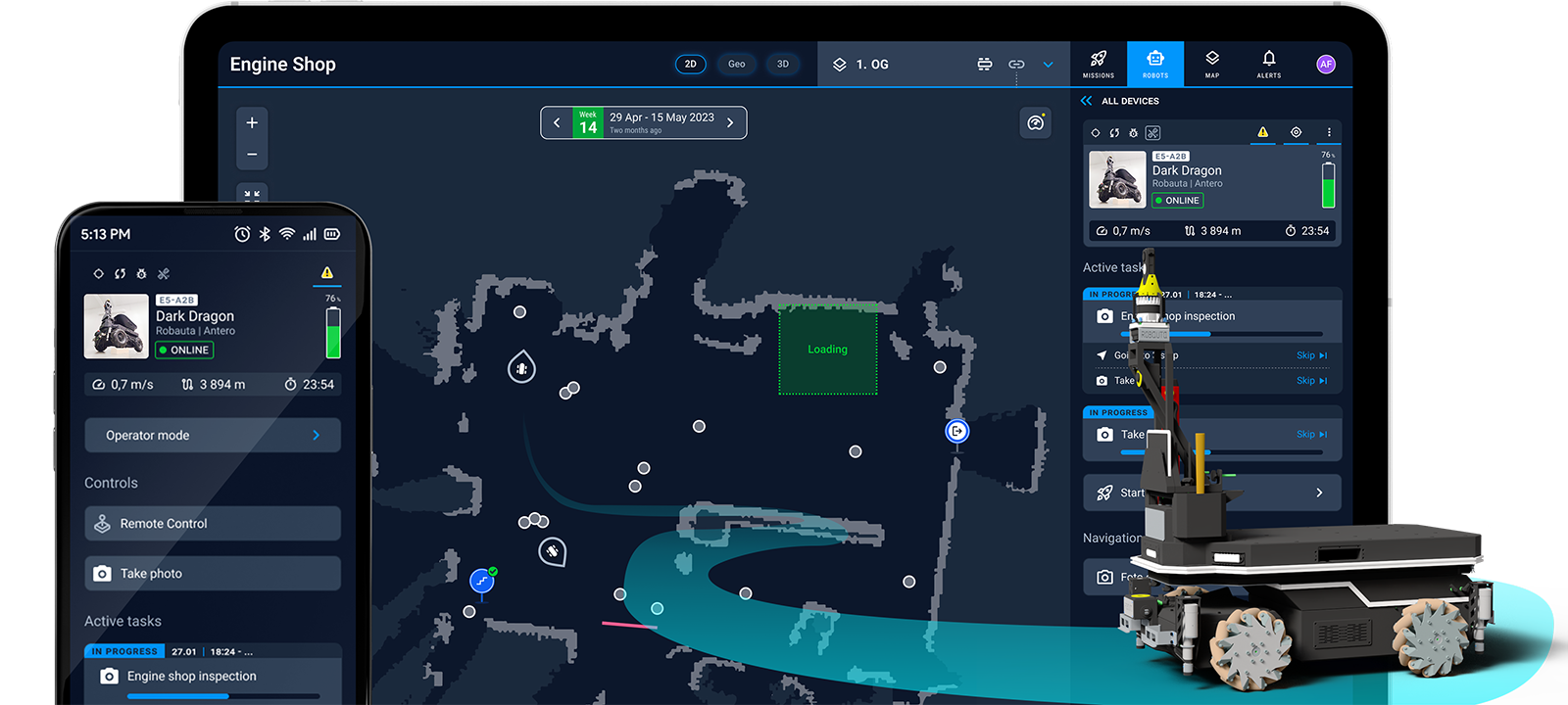 Moves autonomously around the site uses sensors and cameras – its SLAM (Simultaneous Localization and Mapping) system helps it avoid collisions with objects or people.